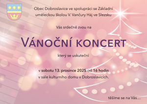 Obec Dobroslavice ve spolupráci se Základní uměleckou školou V. Vančury v Háji ve Slezsku Vás srdečně zvou na VÁNOČNÍ KONCERT, který se uskuteční v sobotu 13. prosince 2025 od 16 hodin v sále kulturního domu v Dobroslavicích.