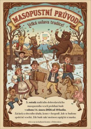 Obec Dobroslavice vás srdečně zve na 5. ročník tradičního dobroslavického masopustního veselí, které bude probíhat v sobotu 14. února 2026 od 10 hodin.